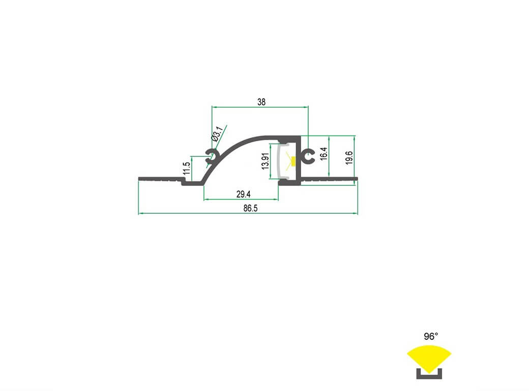 Indirect LED Linear recessed trimless ceiling light strip profile 86.5x19.6mm. Suitable for ceilings, walls and floors.