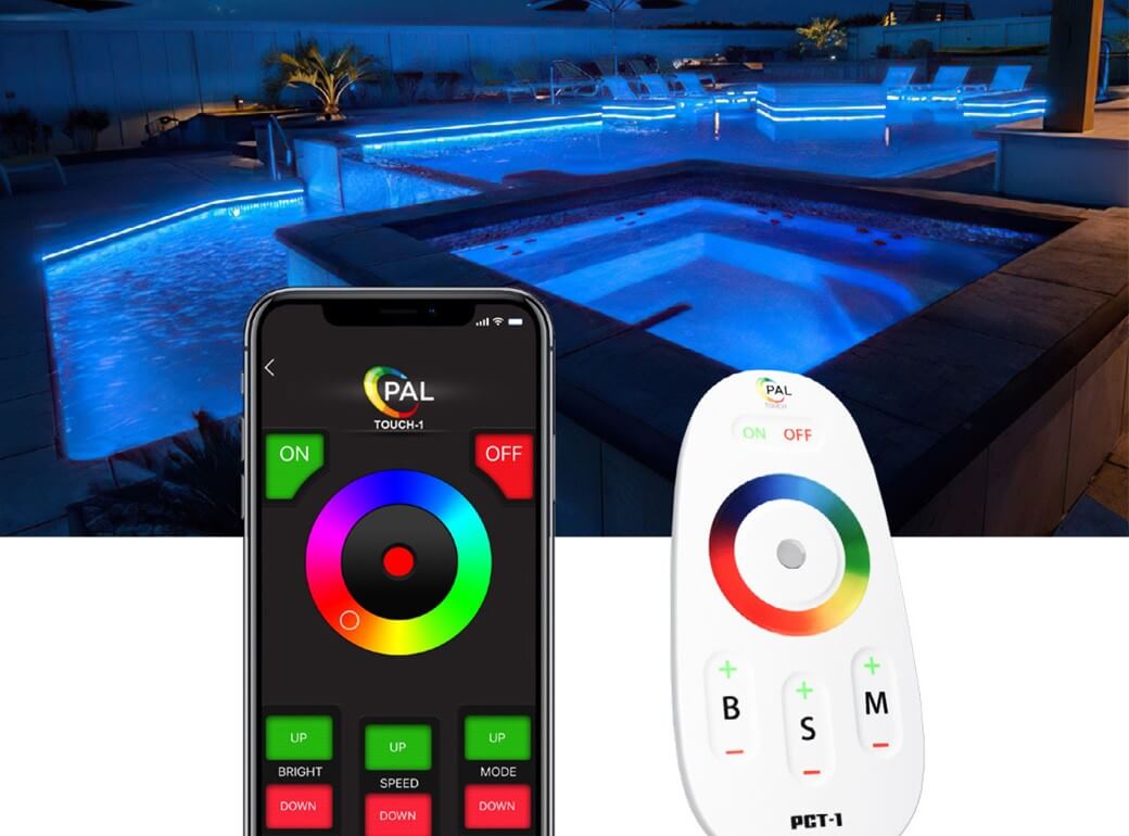 The PAL LED Optics PCR 2D can run 2 PAL EvenGlow pool, pond or garden lights. The PCR-2D is available with either Remote control or WiFi plus remote.