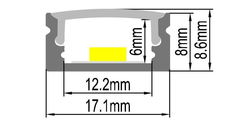 17.1mm x 8.6mm aluminium profile and PMMA diffuser for iFlex LED strip light. Suitable for installation in cabinets, under kitchen and cupboards. Supplied with end caps.